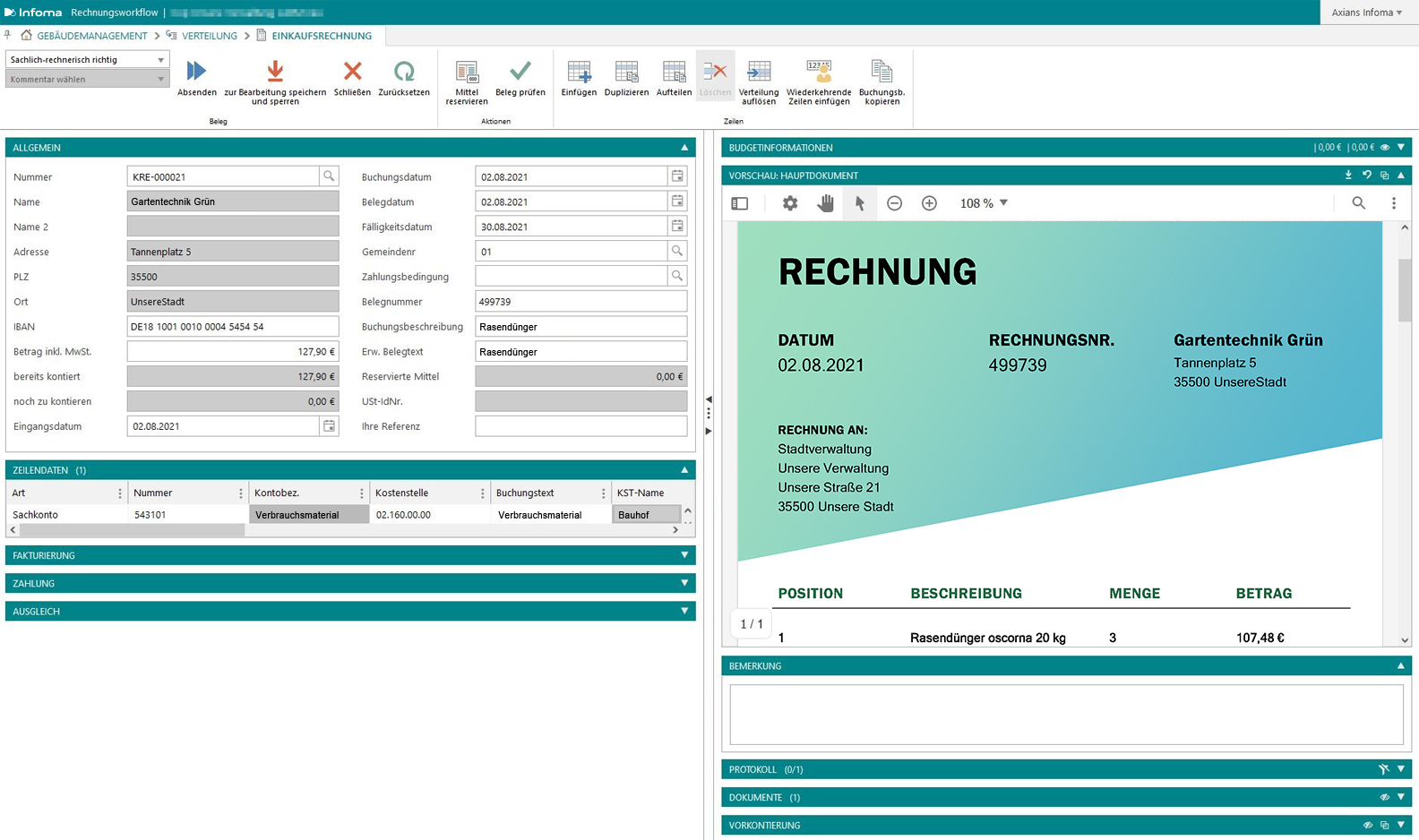 Im Zusammenhang mit der Vermietung von Gebäuden oder Mieteinheiten werden alle Prozesse digital unterstützt – vom workflowbasierten Rechnungseingang bis zur detaillierten Betriebskostenabrechnung und -auswertung.