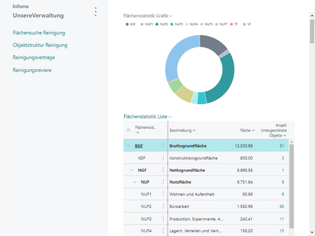 Stellt auf Knopfdruck eine Übersicht der Flächen nach DIN 277 zur Verfügung. Dabei können Fläche, Raum, Geschoss, Gebäudeteil, Gebäude, Liegenschaft sowie alle im Liegenschafts- und Gebäudemanagement