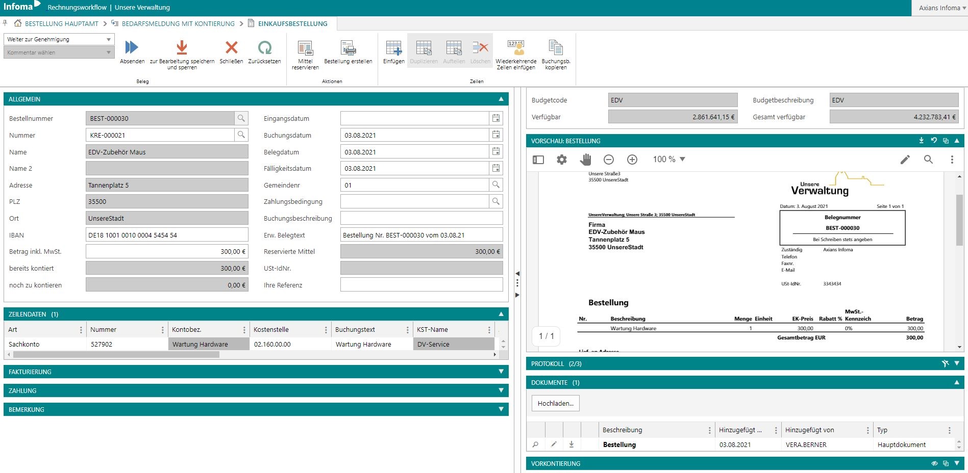 Gibt die elektronische Bedarfsmeldung mit gleichzeitiger Mittelreservierung in den Genehmigungsprozess und generiert im Anschluss eine Bestellung inkl. eines Auftragsschreibens. Der gesamte Prozess wird digital abgebildet und ist für alle Beteiligten transparent, nachvollziehbar und schneller.