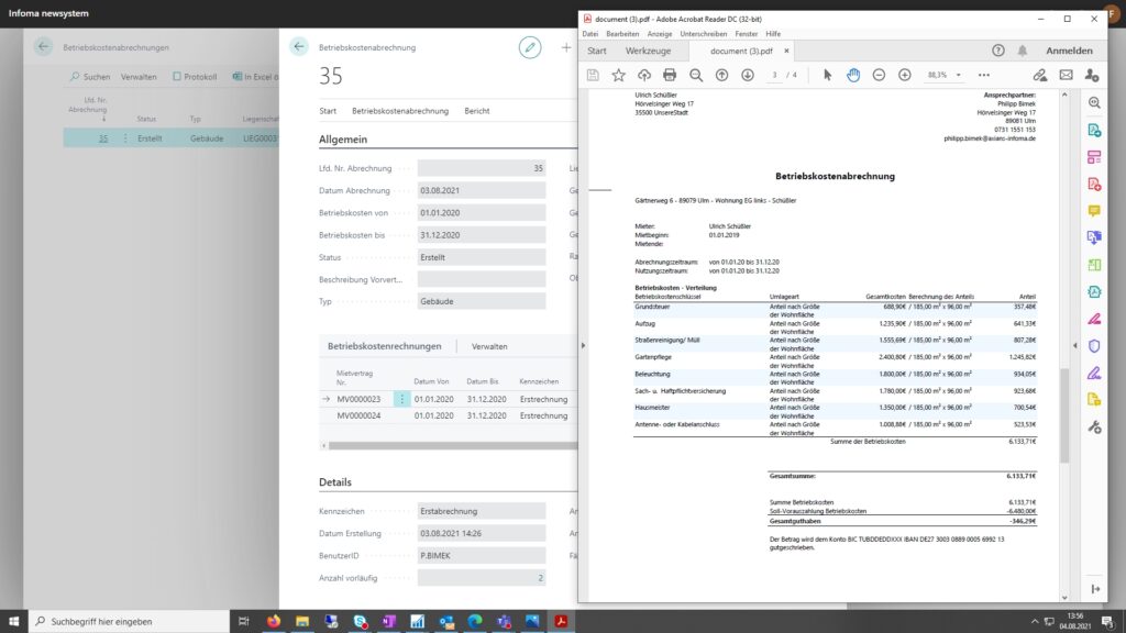 Generiert mit Hilfe von objektspezifischen Nebenkosten- und Verteilungsschlüsseln automatisch Betriebskostenabrechnungen. Abgebildet sind Mieteinheiten, Mietverträge, Gemeinschaftsflächen und weitere Verteil- und Abrechnungseinheiten. Die Umlage der Kosten mündet in eine gesetzeskonforme Betriebskostenabrechnung. Bei gewerblicher Vermietung ist ein detaillierter Ausweis der Mehrwertsteuer möglich. Zudem bietet das Modul die Möglichkeit, Schriftverkehr zu generieren, z. B. die Erstellung von Mietverträgen.