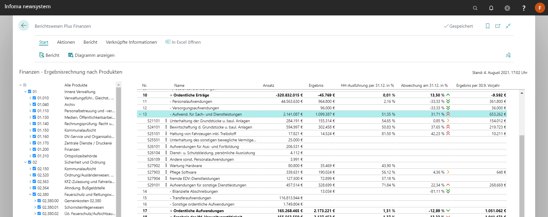 Dafür stehen umfangreiche, vordefinierte Standardberichte aus der Ergebnis- und Finanzrechnung, den Budgets und den Investitionen als Grundlage für Plan- / Ist- und Vorjahresvergleiche, Abweichungsanalysen und vieles mehr zur Verfügung. Alle Auswertungen sind dabei nahtlos in das Infoma newsystem Rollencenter integriert und dabei so einfach zu bedienen, dass sie sich für den flächendeckenden Einsatz von der Verwaltungsspitze bis zum Sachbearbeiter eignen – ganz ohne Schulungs- oder Einrichtungsaufwand.