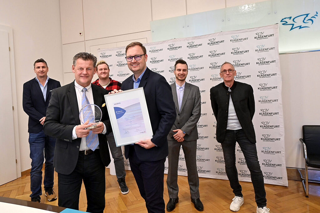 Stadt Klagenfurt wird ausgezeichnet Foto: Stadtkommunikation /Helge Bauer v. l. Werner Koch, Leiter Stabsstelle Informationstechnologie; Harald Rappitsch, Gruppenleiter Applikationsbetreuung/Applikationsentwicklung; Simon Pointner, Applikationsbetreuung; Gerd Sarnitz & Michael Gotthart, Axians Infoma