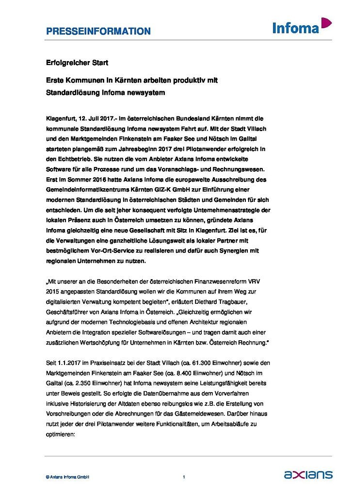 Im österreichischen Bundesland Kärnten nimmt die kommunale Standardlösung Infoma newsystem Fahrt auf. Mit der Stadt Villach und den Marktgemeinden Finkenstein am Faaker See und Nötsch im Gailtal starteten plangemäß zum Jahresbeginn 2017 drei Pilotanwender erfolgreich in den Echtbetrieb. Sie nutzen die vom Anbieter Axians Infoma entwickelte Software für alle Prozesse rund um das Voranschlags- und Rechnungswesen. Erst im Sommer 2016 hatte Axians Infoma die europaweite Ausschreibung des Gemeindeinformatikzentrums Kärnten GIZ-K GmbH zur Einführung einer modernen Standardlösung in österreichischen Städten und Gemeinden für sich entschieden. Um die seit jeher konsequent verfolgte Unternehmensstrategie der lokalen Präsenz auch in Österreich umsetzen zu können, gründete Axians Infoma gleichzeitig eine neue Gesellschaft mit Sitz in Klagenfurt. Ziel ist es, für die Verwaltungen eine ganzheitliche Lösungswelt als lokaler Partner mit bestmöglichem Vor-Ort-Service zu realisieren und dafür auch Synergien mit regionalen Unternehmen zu nutzen.