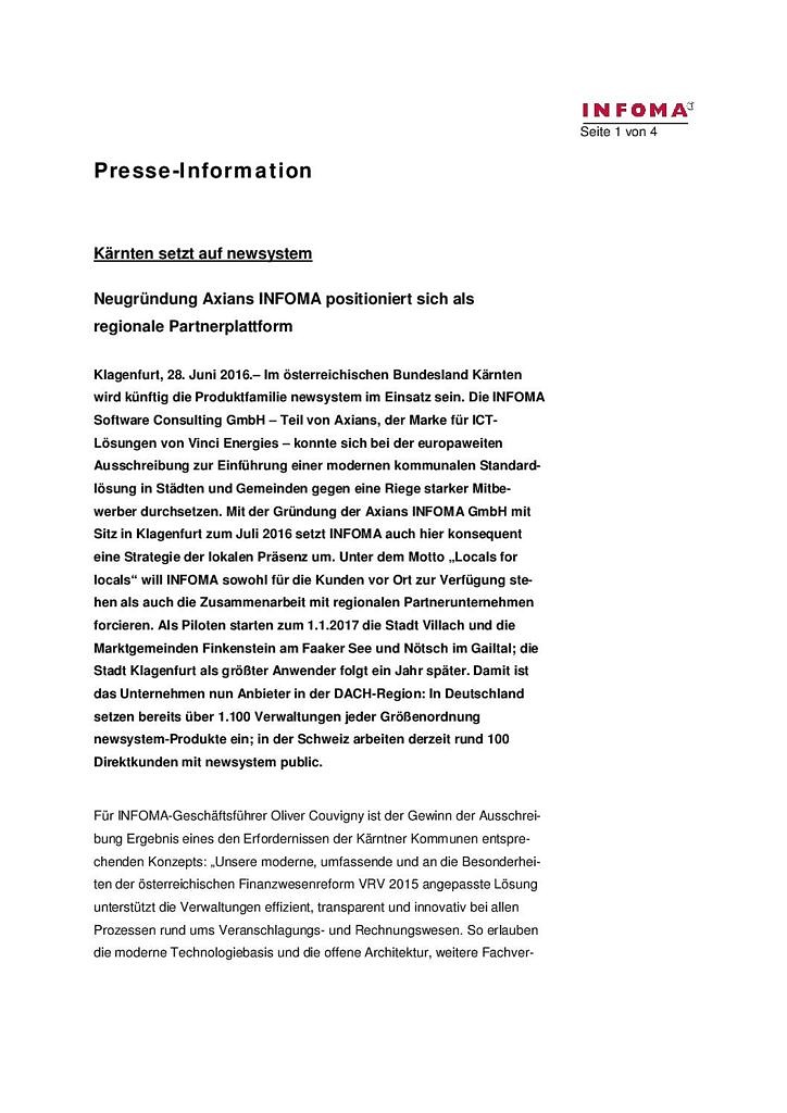 Im österreichischen Bundesland Kärnten wird künftig die Produktfamilie newsystem im Einsatz sein. Die INFOMA Software Consulting GmbH – Teil von Axians, der Marke für ICT-Lösungen von Vinci Energies – konnte sich bei der europaweiten Ausschreibung zur Einführung einer modernen kommunalen Standardlösung in Städten und Gemeinden gegen eine Riege starker Mitbewerber durchsetzen. Mit der Gründung der Axians INFOMA GmbH mit Sitz in Klagenfurt zum Juli 2016 setzt INFOMA auch hier konsequent eine Strategie der lokalen Präsenz um. Unter dem Motto „Locals for locals“ will INFOMA sowohl für die Kunden vor Ort zur Verfügung stehen als auch die Zusammenarbeit mit regionalen Partnerunternehmen forcieren. Als Piloten starten zum 1.1.2017 die Stadt Villach und die Marktgemeinden Finkenstein am Faaker See und Nötsch im Gailtal; die Stadt Klagenfurt als größter Anwender folgt ein Jahr später. Damit ist das Unternehmen nun Anbieter in der DACH-Region: In Deutschland setzen bereits über 1.100 Verwaltungen jeder Größenordnung newsystem-Produkte ein; in der Schweiz arbeiten derzeit rund 100 Direktkunden mit newsystem public.