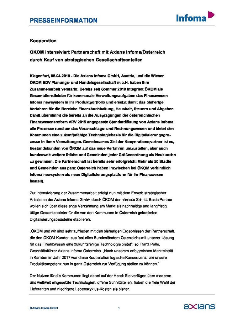 Zur Intensivierung der Zusammenarbeit erfolgt nun mit dem Erwerb strategischer Anteile an der Axians Infoma GmbH durch ÖKOM der nächste Schritt. Beide Partner wollen sich über diese enge Verzahnung am Markt als nachhaltige und langfristig tätige Gesamtanbieter für die von den Kommunen in Österreich geforderten Digitalisierungsbausteine etablieren.