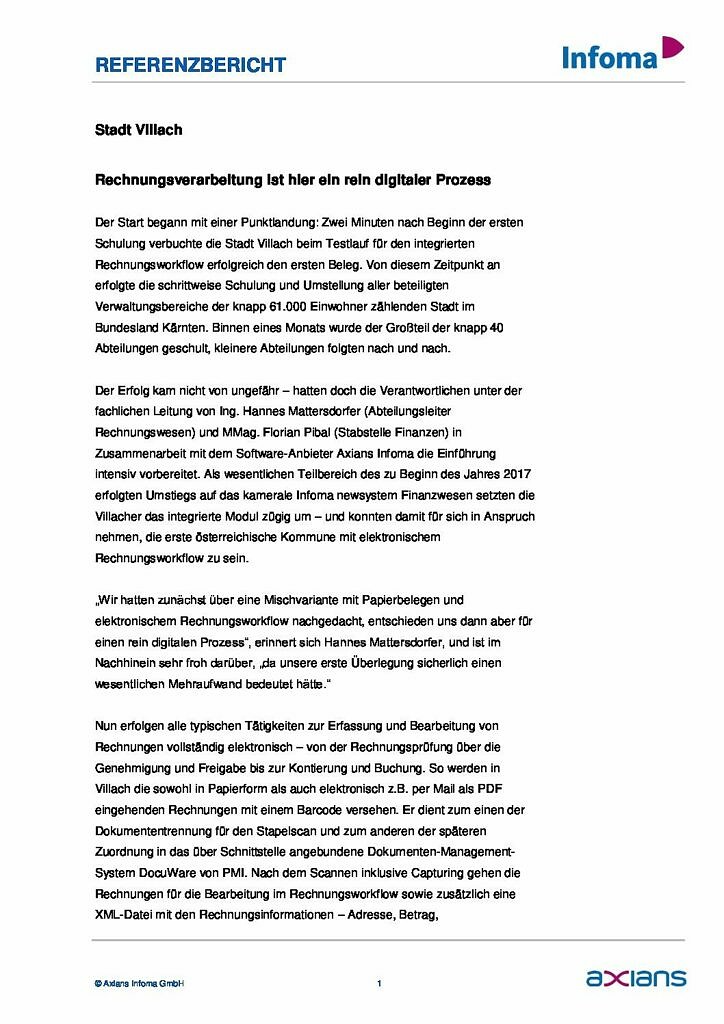 Der Erfolg kam nicht von ungefähr – hatten doch die Verantwortlichen unter der fachlichen Leitung von Ing. Hannes Mattersdorfer (Abteilungsleiter Rechnungswesen) und MMag. Florian Pibal (Stabstelle Finanzen) in Zusammenarbeit mit dem Software-Anbieter Axians Infoma die Einführung intensiv vorbereitet. Als wesentlichen Teilbereich des zu Beginn des Jahres 2017 erfolgten Umstiegs auf das kamerale Infoma newsystem Finanzwesen setzten die Villacher das integrierte Modul zügig um. Damit konnten sie für sich in Anspruch nehmen, die erste österreichische Kommune mit elektronischem Rechnungsworkflow zu sein.